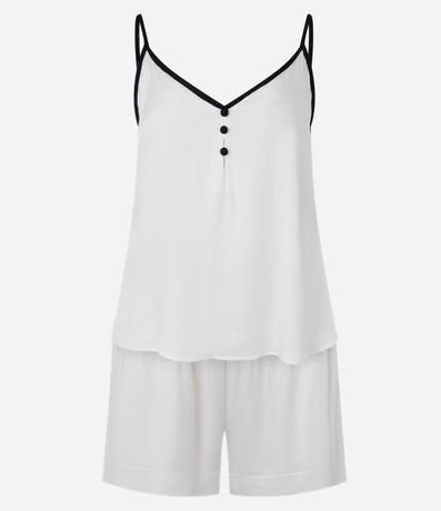 Ref: Conjunto de pijama fresquinho confeccionado em cetim de viscose certificada. São duas peças: blusa com alcinhas reguláveis e detalhes de viés e botões contrastante; e short com cintura elástica.