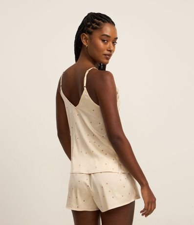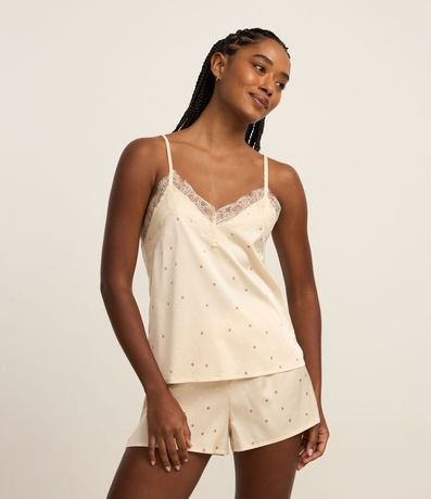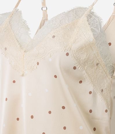 Ref: Conjunto de pijama confeccionado em cetim. São duas peças: blusa com alças finas reguláveis e decote V com renda; e short com cintura elástica. Tudo estampado de bolinhas.