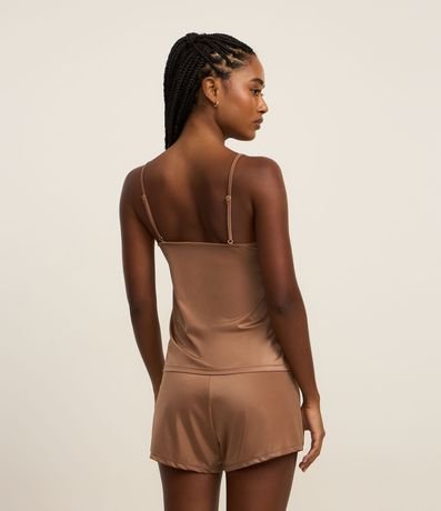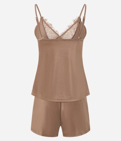 Ref: Conjunto de pijama fresquinho confeccionado em microfibra acetinada. São duas peças: blusa com alcinhas reguláveis, decote V com renda e pingente de conchinha; e short com cintura elástica.