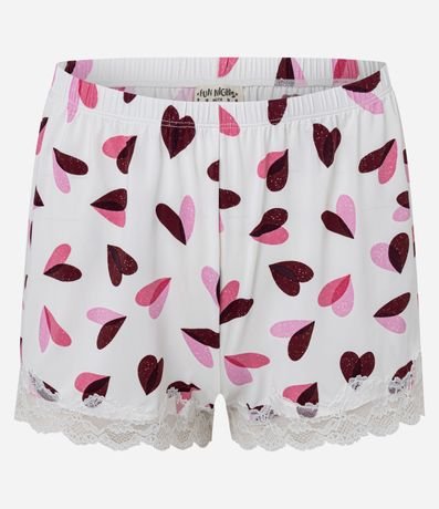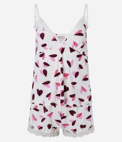 Ref: Conjunto de pijama feminino confeccionado em microfibra, oferecendo conforto e toque suave na pele. O modelo estilo short doll é composto por duas peças: uma blusa com alças finas ajustáveis, decote em v e delicado detalhe em renda no acabamento, e um short curto com cós elástico e barra igualmente adornada com renda. Para completar o visual, o conjunto apresenta estampa de corações por toda a peça, garantindo um charme romântico.