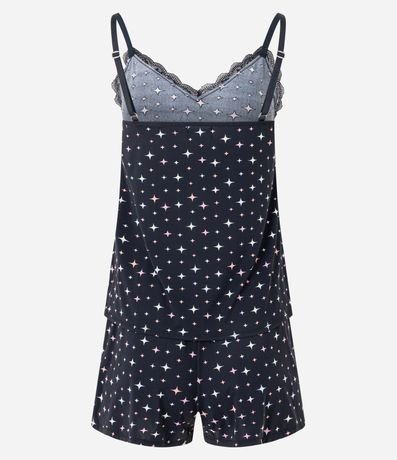 Ref: Conjunto fresquinho de pijama confeccionado em microfibra. São duas peças: blusa com alcinha regulável e detalhe de renda no decote; e short com cintura elástica. Tudo estampado de sparkles.