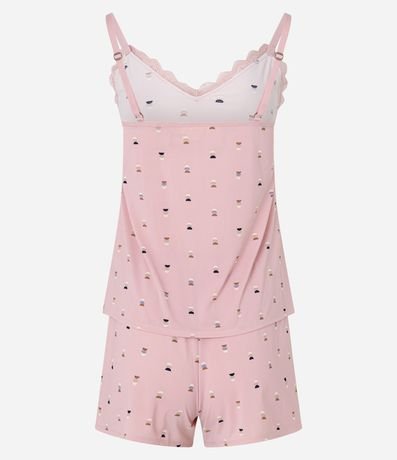 Ref: Conjunto de pijama fresquinho confeccionado em microfibra. São duas peças estampadas de ícones de repetição: blusa de alcinha e short com cintura elástica.