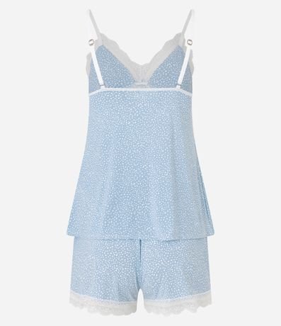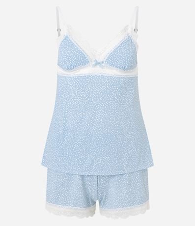 Ref: Conjunto de pijama fresquinho confeccionado em microfibra. São duas peças: blusa com alcinha regulável e renda no busto; e short com cintura elástica. Tudo estampado de bolinhas.