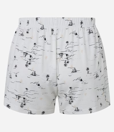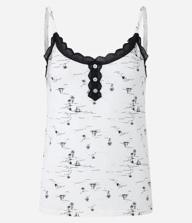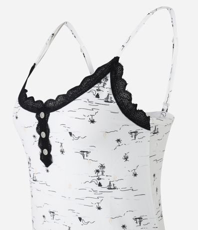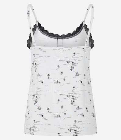 Ref: Conjunto de pijama fresquinho de malha. São duas peças: blusa com alcinhas reguláveis, detalhe de renda e botões no peitilho; e short com cintura elástica. Tudo estampado de barquinhos e coqueiros.