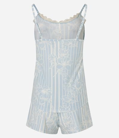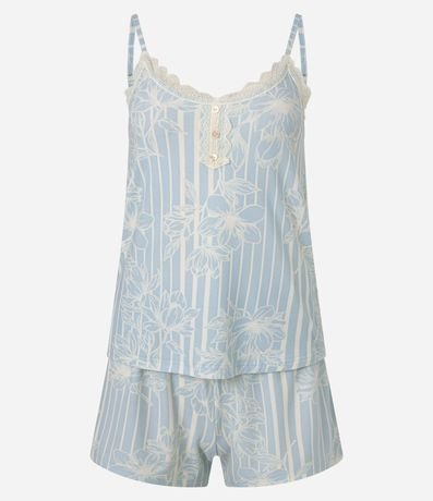Ref: Conjunto de pijama fresquinho com duas peças confeccionadas em malha de toque macio. Blusa com alças finas reguláveis, detalhes de renda e botões no peitilho; e short com cintura elástica. Ambas estampadas de listras e flores.