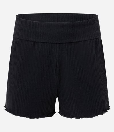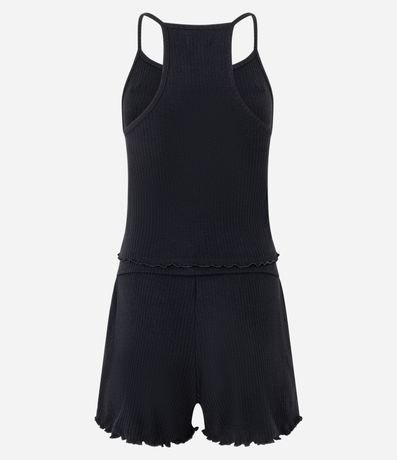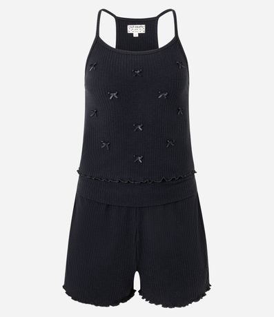 Ref: Conjunto de pijama curto confeccionado em ribana sem estampa. São duas peças: blusa com alcinhas, decote nadador nas costas e aplicação de topinhos; e short com cintura elástica e barra frufru.