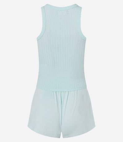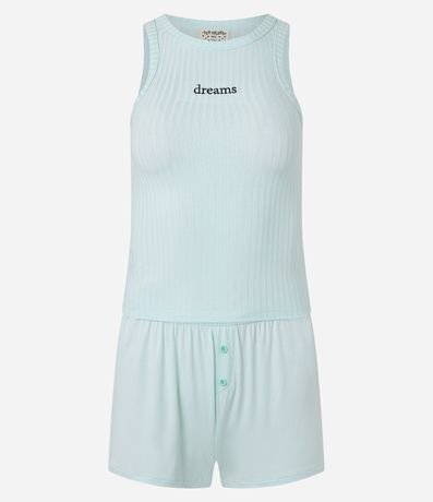 Ref: Conjunto de pijama fresquinho confeccionado em ribana composta por viscose mais sustentável. São duas peças: regata com alça larga, decote halter e bordado "dreams"; e short com cintura elástica e botões decorativos.