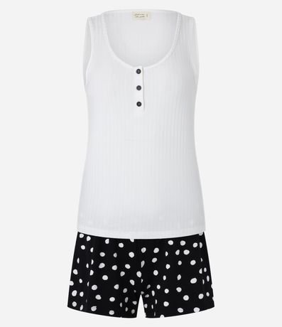 Conjunto de pijama fresquinho confeccionado em viscose certificada. São duas peças: regata canelada com botões no peitilho e short poá com cintura elástica.