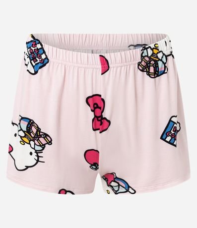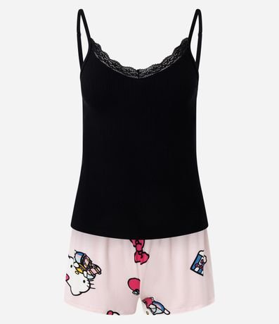 Ref: Conjunto de pijama fresquinho composto por duas peças: regatinha de ribana com renda no decote V; e short com cintura elástica e estampa da Hello Kitty.