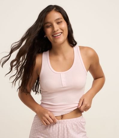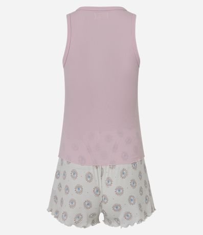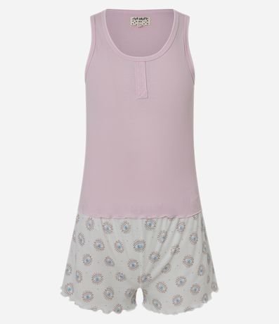 Conjunto de pijama fresquinho confeccionado em ribana. São duas peças: blusa lisa sem mangas com botões; e short com cintura elástica, barra frufru e estampa de olho grego.