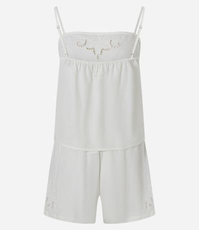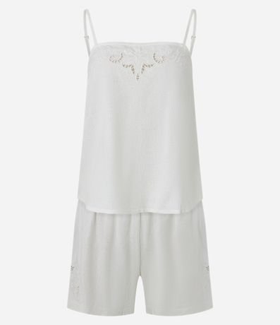 Ref: Conjunto de pijama fresquinho confeccionado em viscolinho composto por viscose certificada. São duas peças: blusa de alcinha regulável e decote reto; e short com cintura elástica. Tudo liso com detalhes de lindo bordado richelieu.