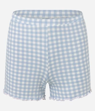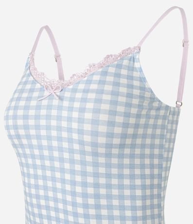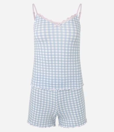 Ref: Conjunto de pijama fresquinho confeccionado em viscolycra. São duas peças: blusa com alcinha ajustável e decote V de rendinha; e short com cintura elástica. Tudo estampado xadrez vichy e frufru nas barras.