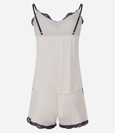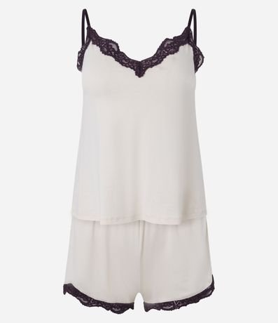 Ref: Conjunto de pijama fresquinho confeccionado em viscose mais sustentável. São duas peças: blusa de alcinha com decote V; e short com cintura elástica. Tudo estampado liso e com aplicação de renda contrastante.