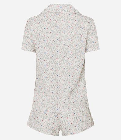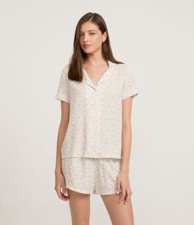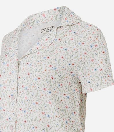 Pijama short doll feminino confeccionada em viscose certificada através de boas práticas ambientais, composto por duas peças. A blusa possui mangas curtas, gola com colarinho e fechamento frontal por botões. O short tem cós com elástico embutido para melhor ajuste. Ambas as peças apresentam estampa floral em toda a superfície, com modelagem confortável.