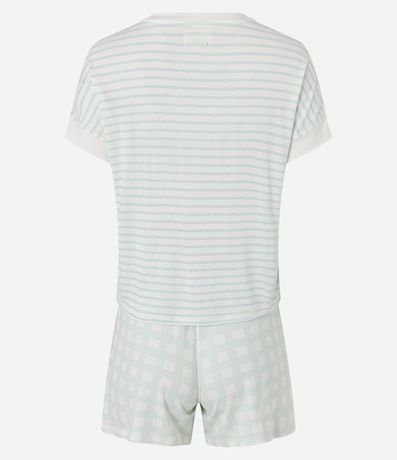 Conjunto de pijama confeccionado em viscose certificada. São duas peças curtas com estampas diferentes: blusa manga curta listrada e short xadrez quadriculado.
