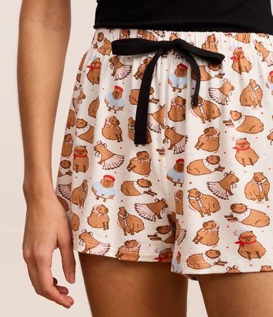 Ref: Conjunto de pijama curto confeccionado com viscose certificada. São duas peças: blusa lisa com alcinhas reguláveis, decote V e rendinha; e short com cintura elástica, amarração e estampa fofa de capivaras.