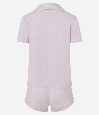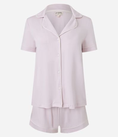 Conjunto de pijama americano confeccionado em malha de viscose mais sustentável. São duas peças: blusa manga curta com gola lapela e abotoamento frontal; e short com cintura elástica e amarração. Tudo liso e com vieses contrastantes.