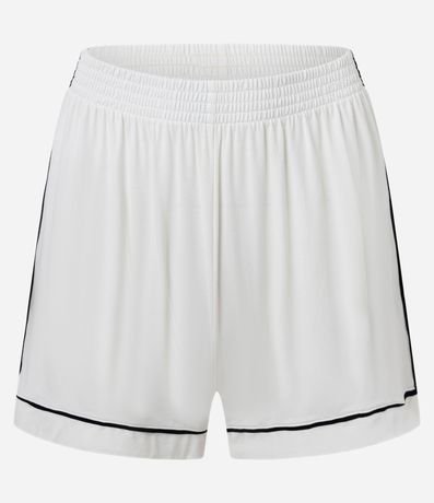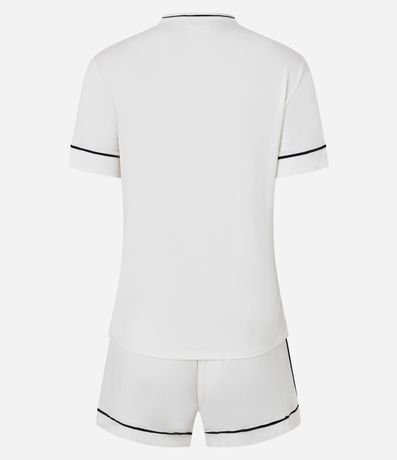 Conjunto de pijama confeccionado em viscose. São duas peças: blusa manga curta com bolsinho; e short com cintura elástica. Tudo estampado liso com detalhes de vieses contrastantes.