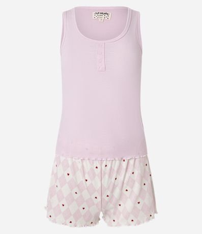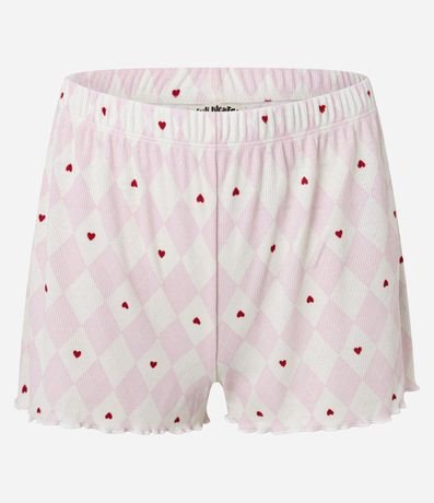 Ref: Conjunto de pijama feminino de modelo shortdoll, confeccionado em ribana e composto por 02 peças: blusa e short. A blusa de modelo regata possui gola redonda com botões no peitilho, textura canelada e barra com acabamento em costura frufru. O shortinho conta com cós elástico, estampa geométrica com mini corações e também possui acabamento frufru.
