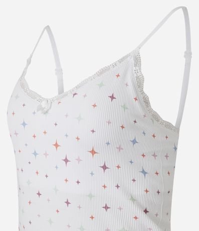 Conjunto de pijama fresquinho composto por duas peças: blusa de alcinha com renda no decote; e short com cintura elástica e barra frufru. Tudo estampado de brilhinhos coloridos.