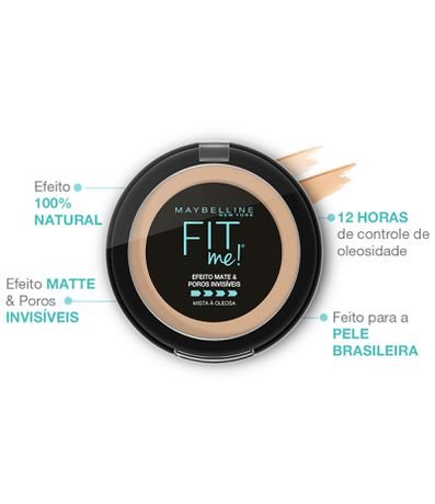 O Novo Pó compacto Fit Me! traz uma textura rica e de cobertura que vai da natural à media com efeito 100% matte! É o Pó Ideal para tirar o excesso de brilho e selar a maquiagem na pele! Além disso, sua fórmula matificante e de longa duração ajuda a controlar o brilho removendo as marcas de oleosidade! O novo pó Fit-me garante até 12 horas de um acabamento natural, além de cobrir imperfeições e não obstruir os poros!