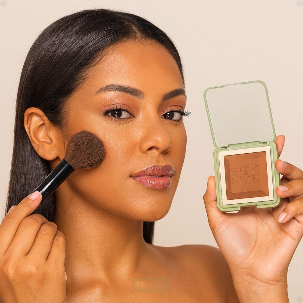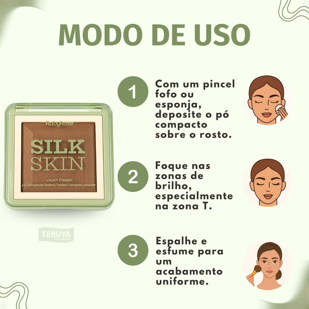 Com o auxílio de um pincel ou esponja, aplique o Pó Compacto Ruby Rose Silk Skin Light Finish PC70 sobre a pele do rosto, especialmente na zona T (testa, nariz e queixo), para selar a maquiagem e controlar o brilho.
