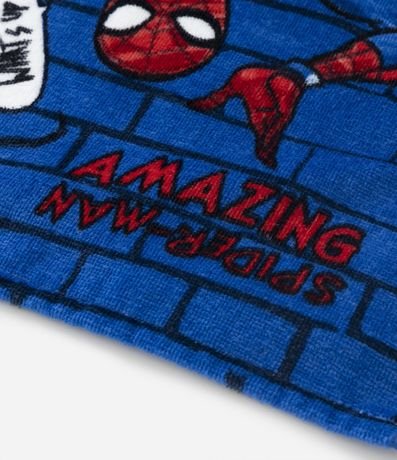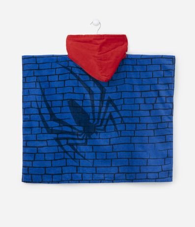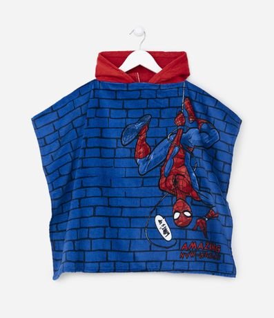 Ref: Poncho infantil, em algodão, atoalhado, capuz contrastante e estampa de tijolinhos e Homem Aranha pendurado.