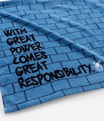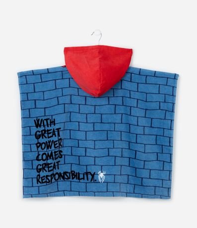 Ref: Poncho infantil confeccionado em algodão mais sustentável, atoalhado, capuz contrastante e estampa de tijolinhos e Homem Aranha pendurado.