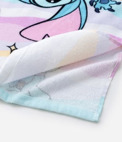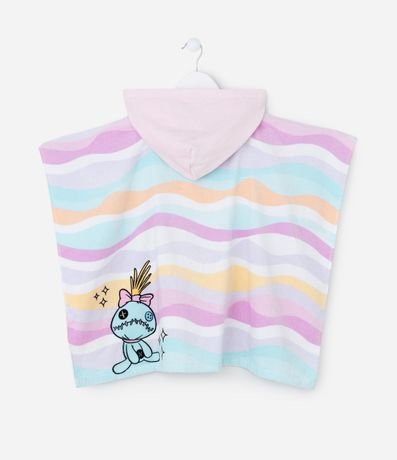 Ref: Poncho infantil confeccionada em algodão mais sustentável através de boas práticas ambientais, de modelo atoalhado, com capuz contrastante e estampa do do Stitch, Angel e Xepa.