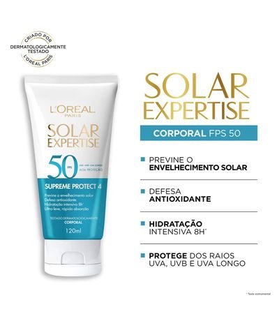 Solar Expertise FPS 50 garante proteção até contra os raios UVA longos que penetram mais profundamente na pele. Além disso, defesa antioxidante para ajudar a preservar o colágeno; hidratação intensiva 8 horas para uma pele mais radiante e com uma cor visivelmente saudável. Possui textura leve e de rápida absorção para uma pele macia e de toque aveludado.