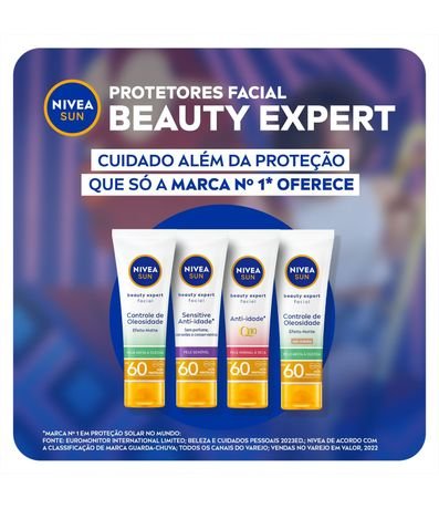 NIVEA SUN Facial Beauty Expert Sensitive FPS 60 é um protetor solar de muito alta proteção que não possui perfumes, corantes e conservantes em sua fórmula, sendo ideal para as peles sensíveis.