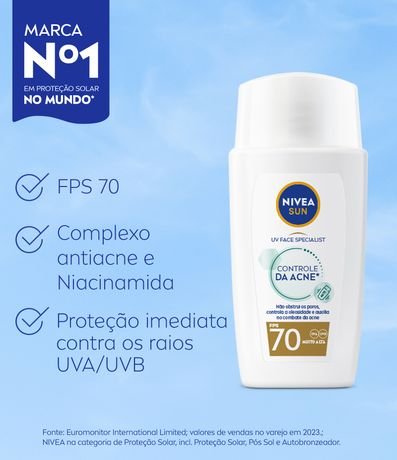 O que é? NIVEA Sun UV Face Specialist Controle da Acne FPS 70 40ml é um protetor solar recomendado para pele oleosa e propensa a acne com alta proteção, complexo anti-acne e Niacinamida que oferece cuidado diário superior para uma pele saudável. Além de oferecer proteção contra os efeitos causados pela luz como o envelhecimento precoce, o fluido leve e suave não obstrui os poros, é não oleoso e não pegajoso, proporcionando um efeito matte de 8 horas para um visual sem brilho, sensação de pele hidratada e uma aparência visivelmente saudável. Produto testado dermatologicamente e oftalmologicamente. Para que serve? Recomendado para pele oleosa e propensa a acne, ele oferece proteção por dentro graças ao Licochalcona A*, um poderoso antioxidante natural que ativa o mecanismo de defesa da pele, protegendo a nível celular e por fora contra os raios UVA/UVB, auxiliando na redução do estresse oxidativo dos radicais livres causados pela luz visível e poluição. Produto não comedogênico, clinicamente testado. *Licochalcona A, um antioxidante que atua a nível celular e auxilia na redução do estresse oxidativo da pele induzido pela exposição à luz visível e poluição.