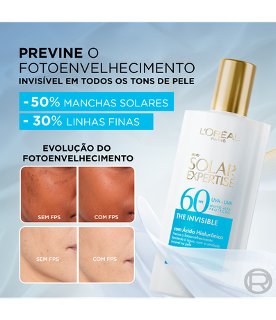 Desenvolvido pelos laboratórios de L'Oréal Paris, o Solar Expertise Fluido é um protetor diário anti-fotoenvelhecimento. Protege a sua pele dos raios UVB, UVA e UVA longo, enriquecida com o poderoso ativo dermatológico ácido hialurônico, e exclusiva tecnologia NETLOCK. Previne o envelhecimento precoce, além de linhas de expressão, rugas e manchas solares.
