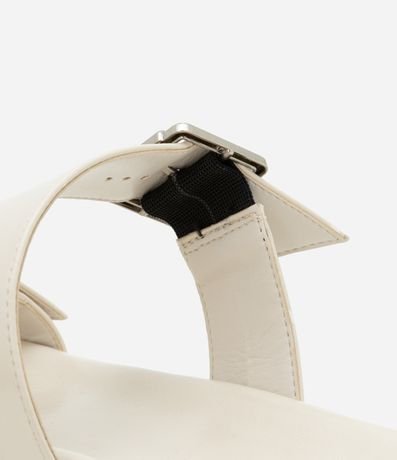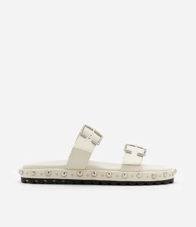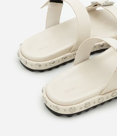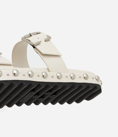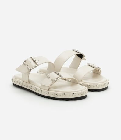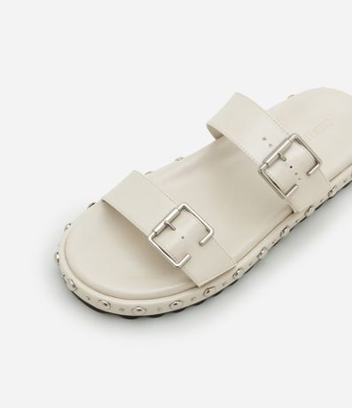 Ref: Rasteira feminina confeccionada em material sintético com bico redondo, tira dupla larga com fivelas laterais e detalhe de rebites na sola.