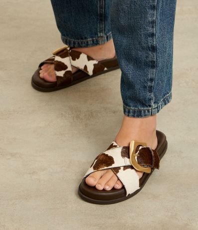 Ref: Rasteira feminina confeccionada em couro. Possui tiras largas cruzadas com estampa animal print peluciada, fivela grande e solado tratorado.