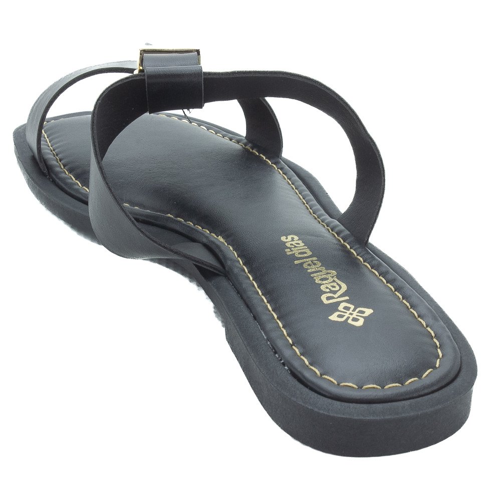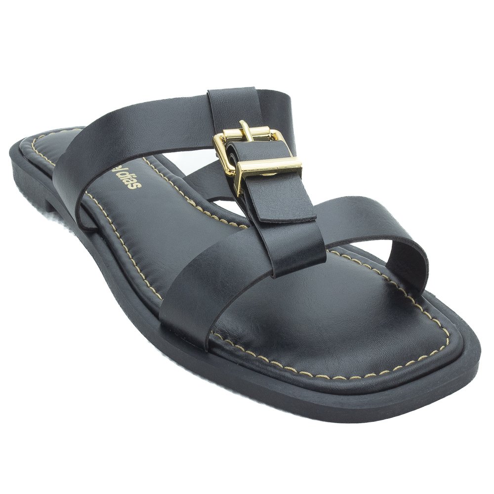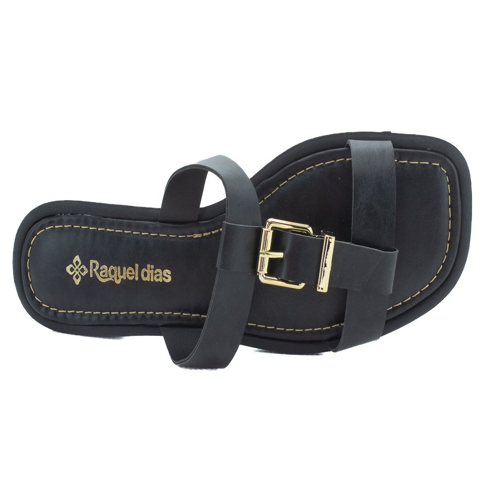 Ref: A Rasteira Raquel Dias, na cor preta, é a escolha ideal para quem busca conforto com um toque de elegância casual. Produzida no Brasil em material sintético, esta rasteirinha apresenta um design moderno com bico sutilmente quadrado e solado flat. O cabedal é composto por duas tiras sobrepostas, que se destacam pelo seu layout estiloso. A tira superior é adornada por uma fivela metálica na cor dourada, que funciona como um elemento decorativo de destaque, adicionando um brilho sofisticado e um charme clássico ao calçado. O conforto é garantido pela palmilha macia com o logo da marca "Raquel Dias" em dourado. A palmilha e a sola apresentam um acabamento de costura pespontada em tom contrastante dourado, que destaca o contorno do calçado. Perfeita para o dia a dia, esta rasteira é um modelo versátil e indispensável para compor looks cheios de estilo.