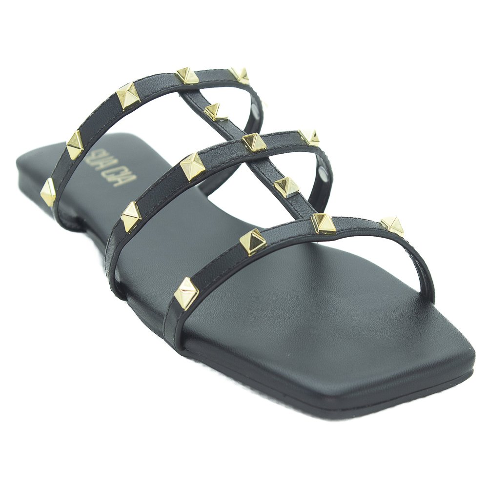 Ref: A Rasteira Feminina Sua Cia 8230.16134 combina praticidade e elegância em um design moderno. Confeccionada em material sintético resistente e fácil de limpar, conta com tiras finas pretas adornadas por spikes dourados que adicionam atitude e sofisticação ao visual. Sua palmilha acolchoada garante conforto prolongado, enquanto o solado flat antiderrapante proporciona segurança e leveza a cada passo. Versátil, é ideal para compor produções casuais e urbanas, acompanhando você em momentos de lazer, no trabalho ou em passeios do dia a dia com muito estilo.