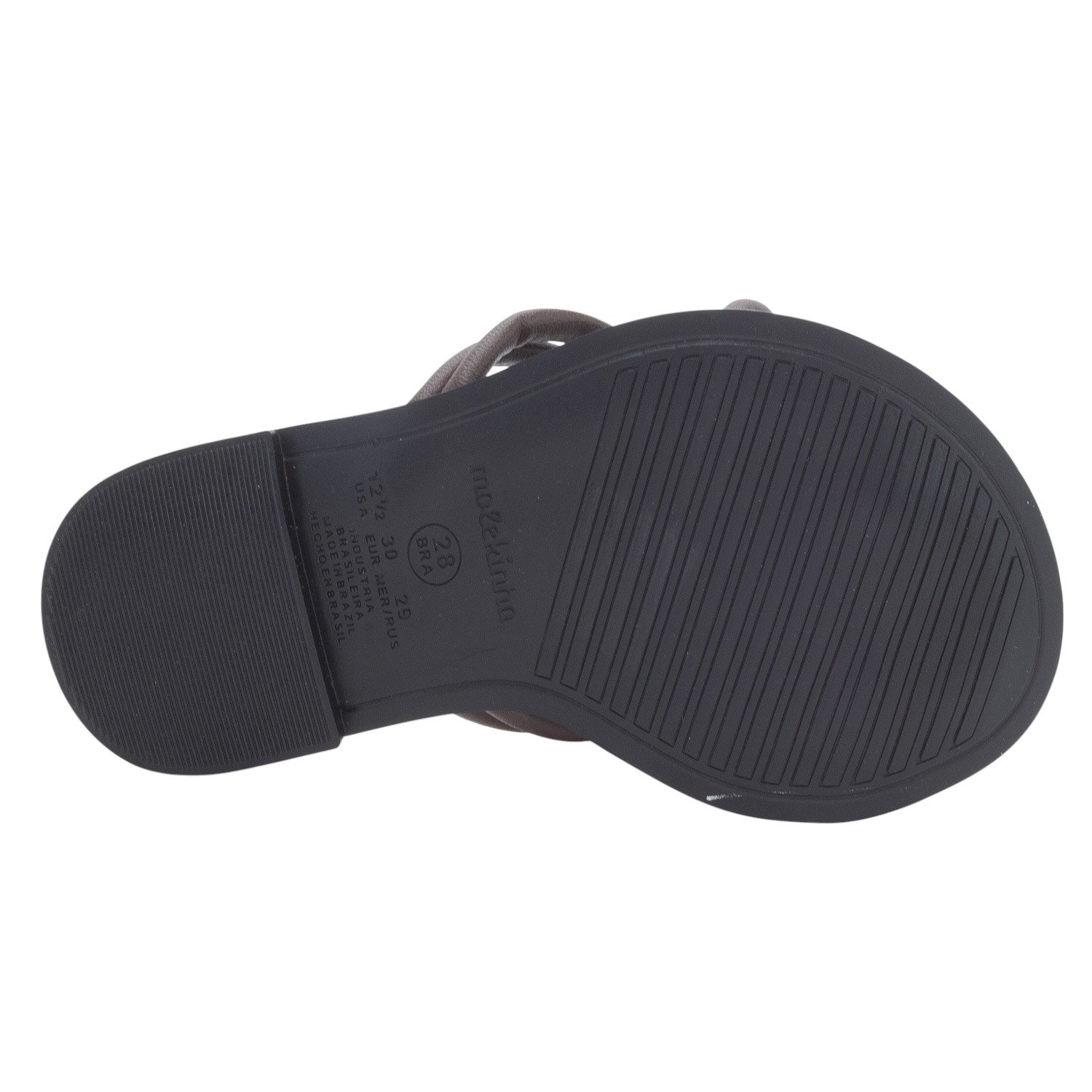 Ref: A Rasteira Infantil Menina Molekinha 2342.111 na cor Marrom é a união perfeita de conforto, delicadeza e estilo para os pezinhos das pequenas. Seu design moderno apresenta um conjunto de tiras finas e tubulares em material sintético marrom que se cruzam suavemente sobre o peito do pé. O grande destaque do modelo é o acessório metálico em tom dourado que envolve elegantemente o dedão, conferindo um toque de sofisticação e charme ao calçado. Confeccionada com materiais de alta qualidade, a rasteira garante durabilidade e um toque macio para o uso diário. A palmilha interna, que ostenta o logo da Molekinha em amarelo/dourado, possui um pesponto externo em linha branca que cria um contraste visual agradável com o marrom da base. O acabamento refinado se estende ao contorno do solado, adornado com aplicações discretas de microtachas e com um padrão de corações. Para garantir segurança e firmeza a cada passo, o solado é emborrachado e antiderrapante, na cor preta, apresentando ranhuras horizontais para melhor tração. Versátil e cheia de personalidade, esta rasteira é a escolha ideal para completar os looks das meninas em passeios, ocasiões especiais ou no dia a dia, com todo o conforto e toque fashion típico da Molekinha.