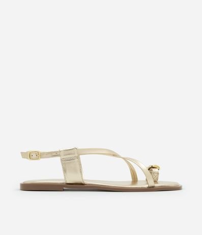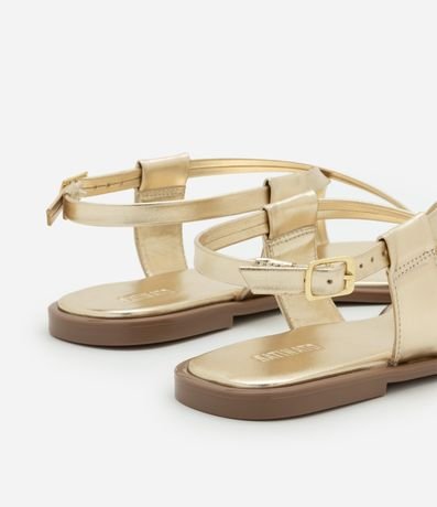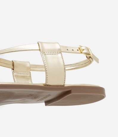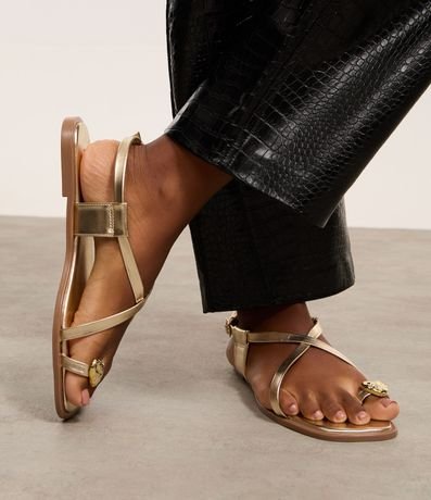 Sandália rasteira feminina confeccionada em material sintético, com acabamento metalizado e tiras em X. Possui fechamento por fivela e detalhe de tira no dedão, com aplicação de adorno metálico em formato de coração orgânico.
