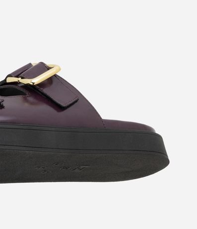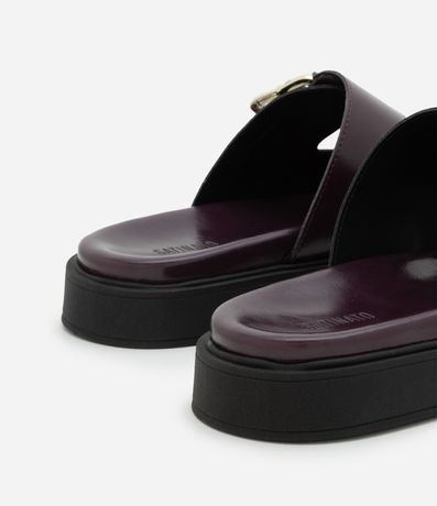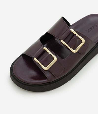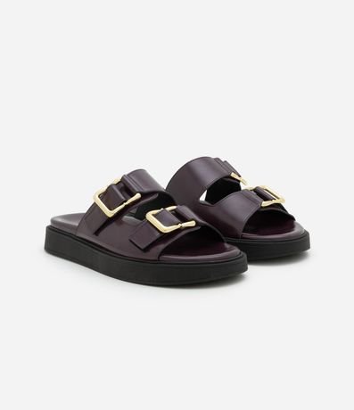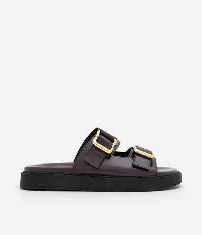 Ref: Sandália modelo slide com duas tiras largas no cabedal, cada uma com fivela metálica. Palmilha moldada com leve contorno e bordas arredondadas.