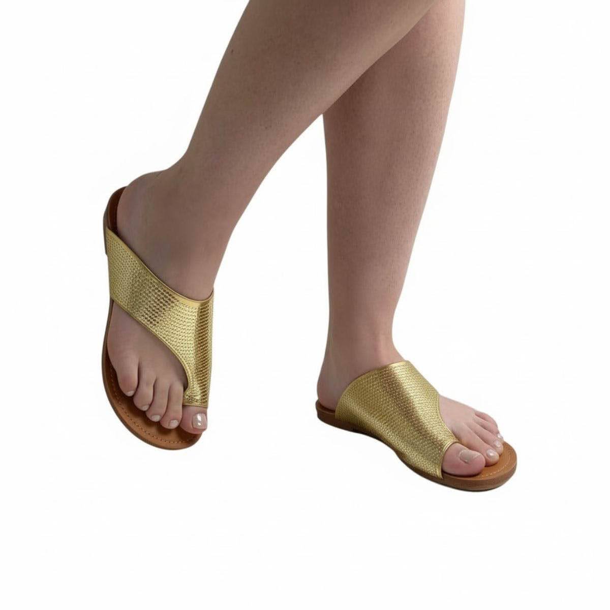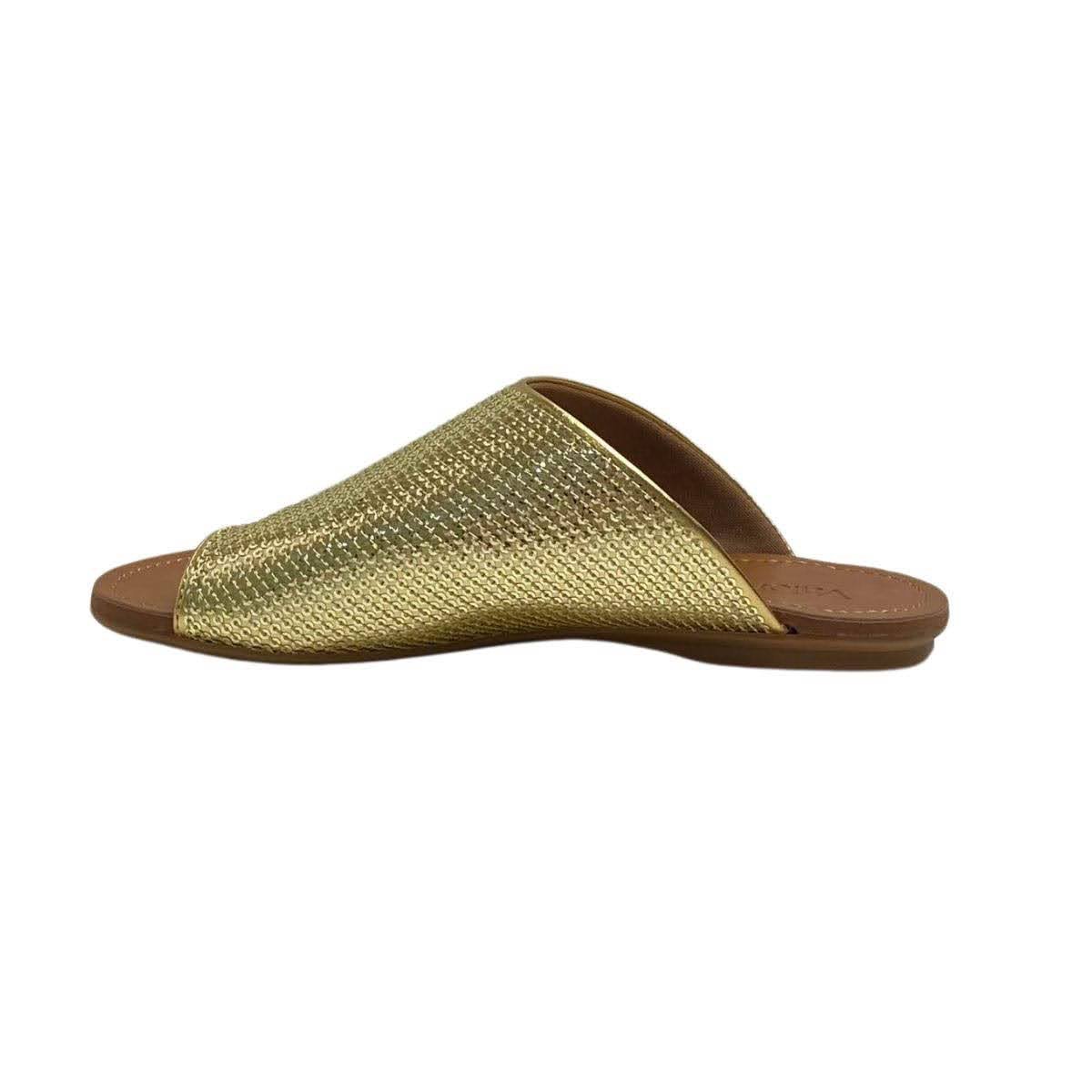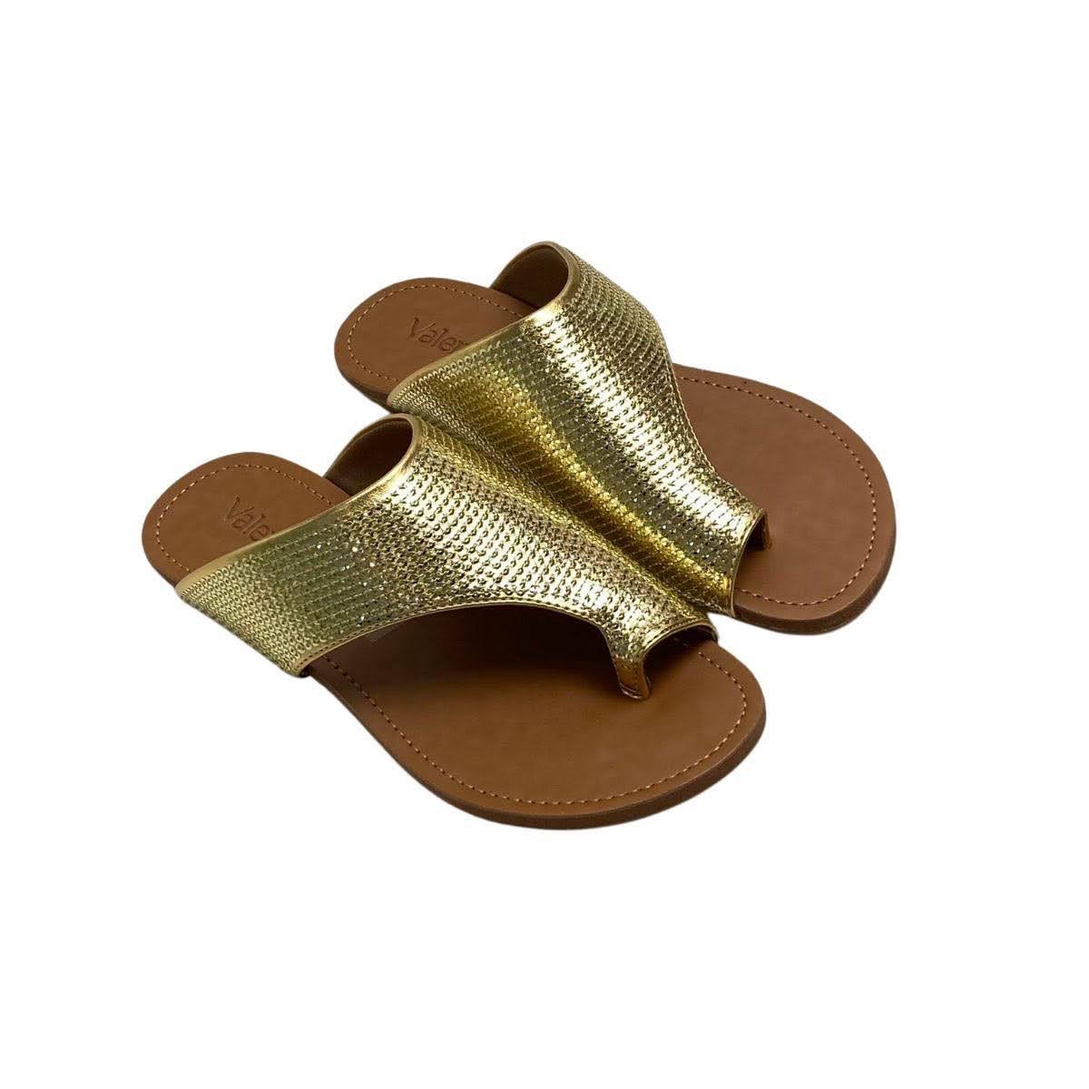 Ref: Rasteira Valentina Feminina 230268 Dourada. A Rasteira Emma Bordada Valentina Flats é a escolha perfeita para adicionar um toque de brilho e elegância ao seu visual de verão. Com um deslumbrante acabamento em paetê, esta sandália é a combinação ideal de estilo e conforto para os dias quentes.