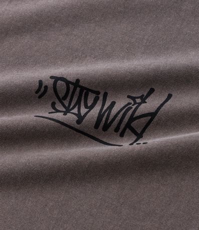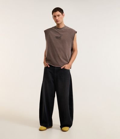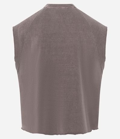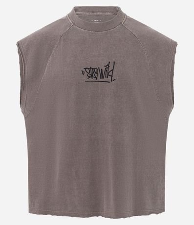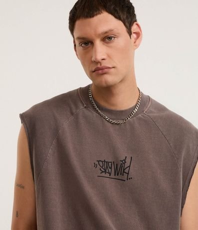 Ref: Regata masculina confeccionada em algodão mais sustentável com boas práticas ambientais no modelo boxy. possui gola redonda em ribana, barra cortada a fio, estampa lettering e efeito estonado.