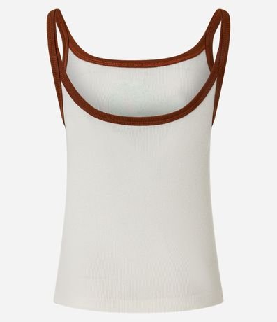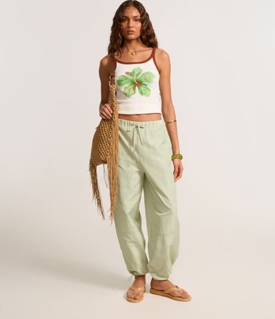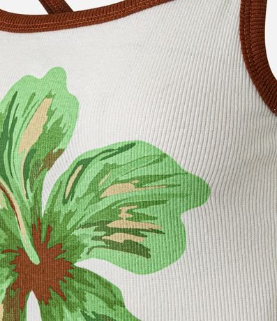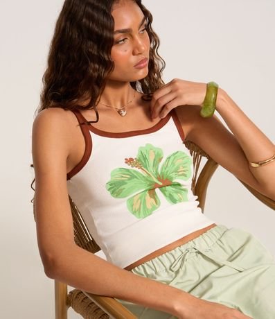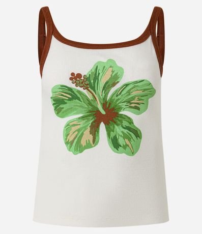 Ref: Regata feminina confeccionada em algodão de material mais sustentável. Possui viés contrastante e estampa de flor hibisco.
