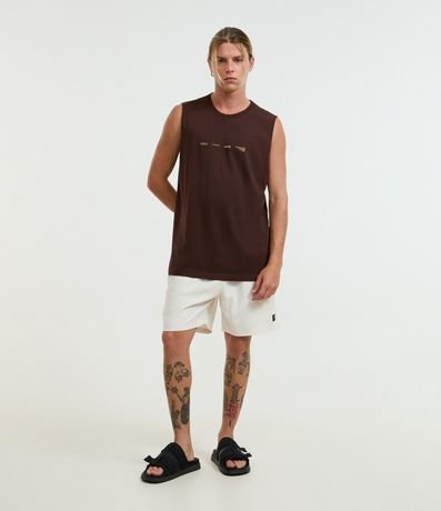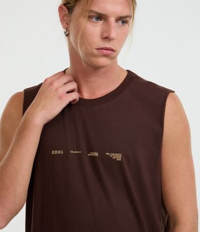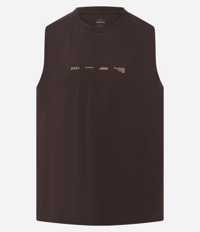 Ref: Regata masculina confeccionada em algodão mais sustentável com boas práticas ambientais, no modelo comfort. Possui gola redonda e estampa lettering frontais e traseiras.