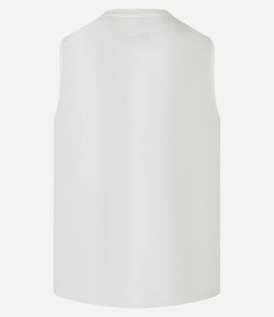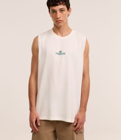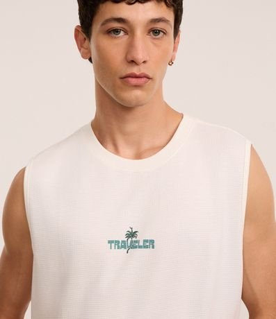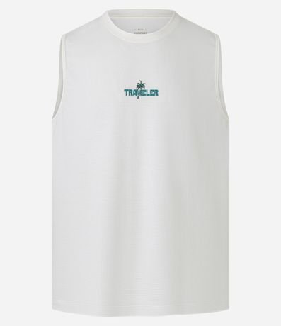 Ref: Regata masculina confeccionada em algodão mais sustentável com boas práticas ambientais, no modelo comfort, possui gola redonda, textura quadriculada e estampa lettering "Traveler" com coqueiro.