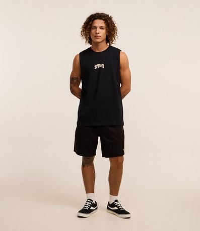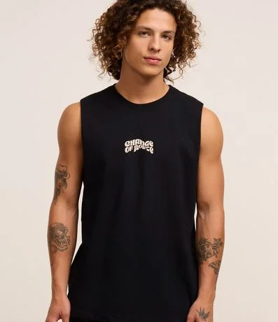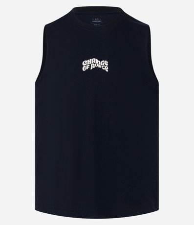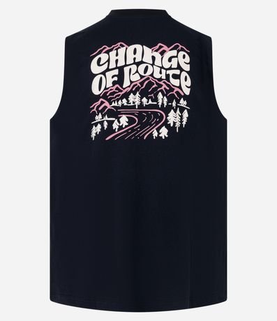 Regata masculina confeccionada em algodão mais sustentável com boas práticas ambientais no modelo comfort com estampa lettering e montanhas.