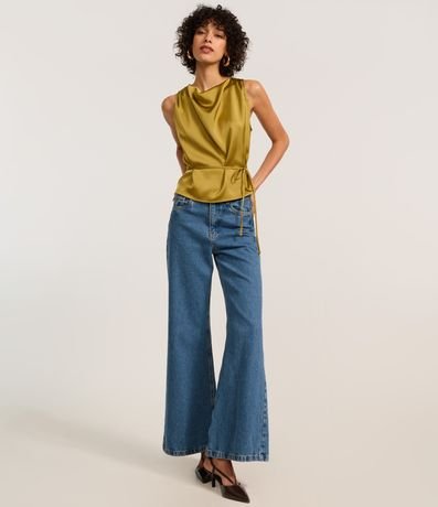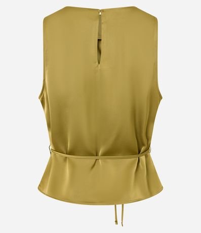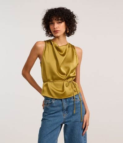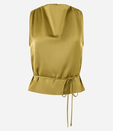 Blusa feminina regata em cetim com boas praticas ambientais, decote degagê, com amarração na cintura e gota nas costas.