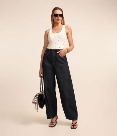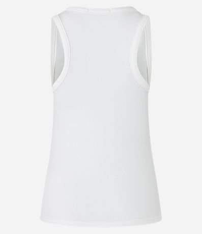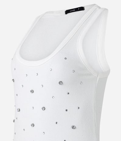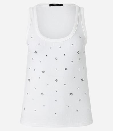 Regata com decote quadrado e pedrarias brilhantes de strass aplicadas além de textura canelada. Confeccionada em ribana de algodão mais sustentável.