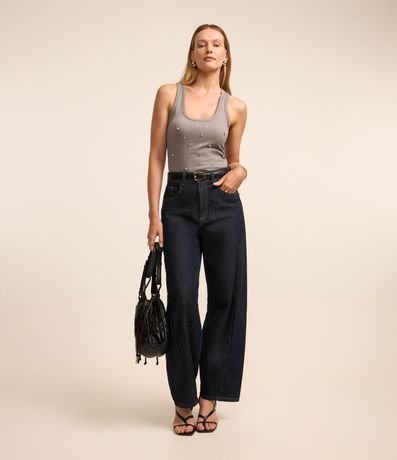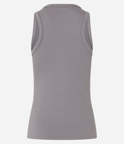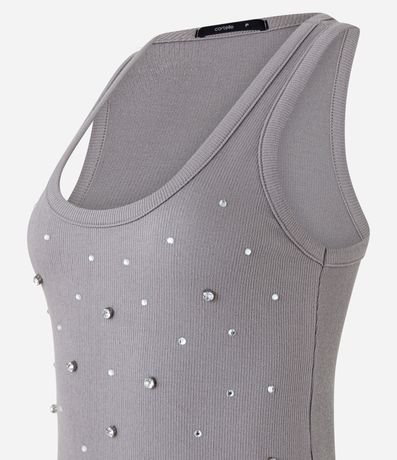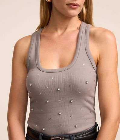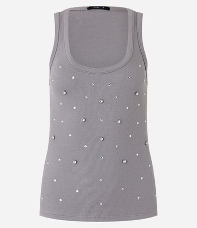 Ref: Regata com decote quadrado e pedrarias brilhantes de strass aplicadas além de textura canelada. Confeccionada em ribana de algodão mais sustentável.