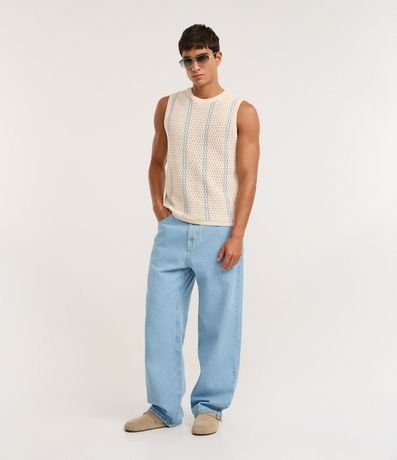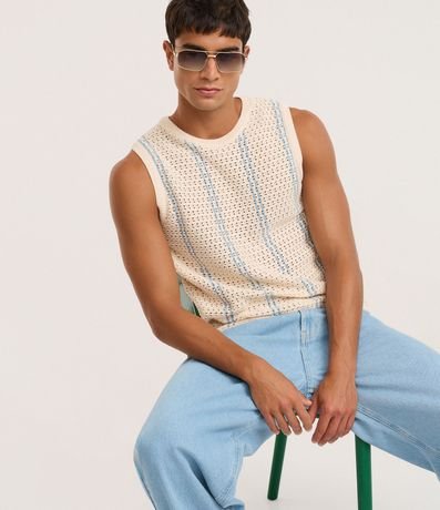 Regata masculina confeccionada em algodão mais sustentável. Possui gola redonda, cavas nos braços com acabamento, listras verticais e textura de furinhos.